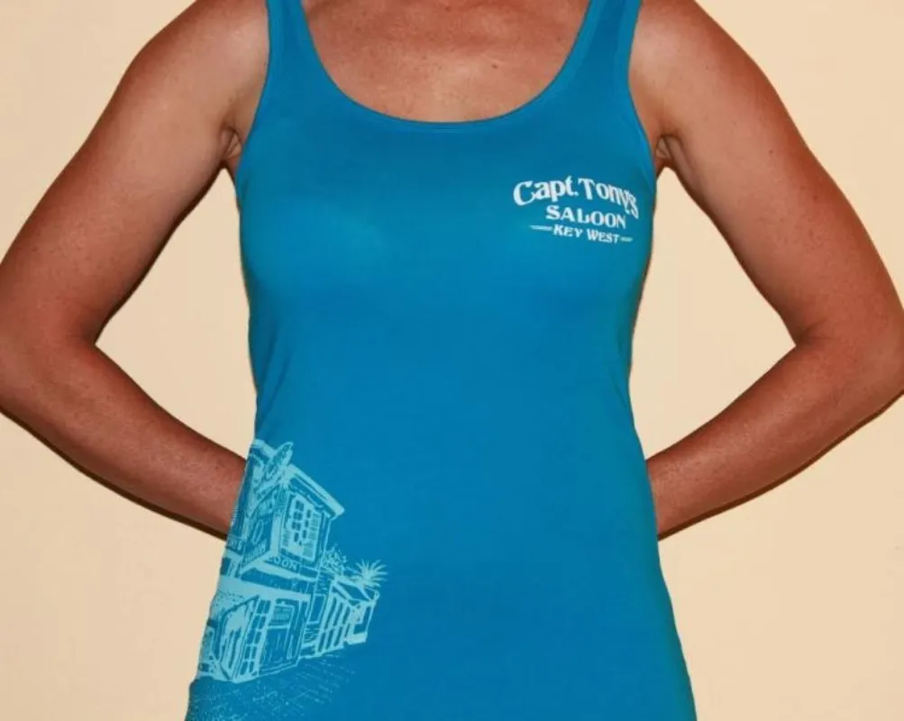 Ladies Classic sporty tank features a picture of Captain Tony’s Saloon that wraps around the side of the tank.